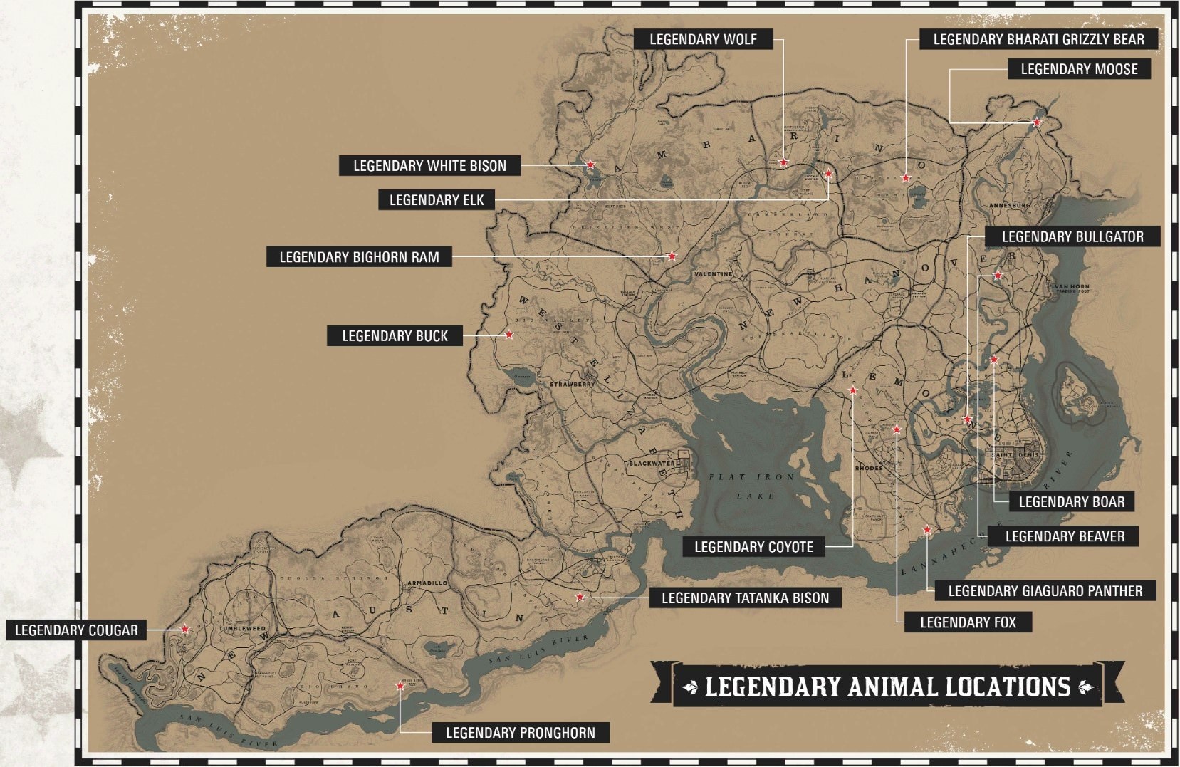 - Bisonte: Anche il bisonte abita una regione inaccessibile nelle fasi iniziali; si trova infatti a sud di Thieves Landing, proprio dove il San Luis River sfocia nel lago. Per raggiungere quest'area, se ancora non la vedete, dovete puntare a sud di Blackwater.